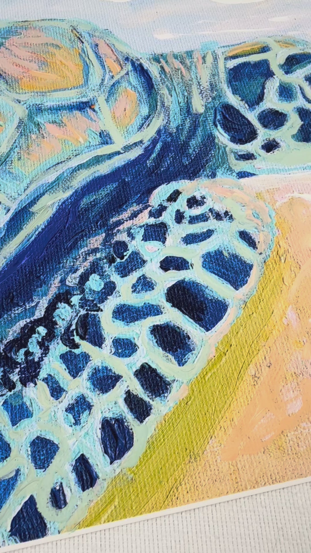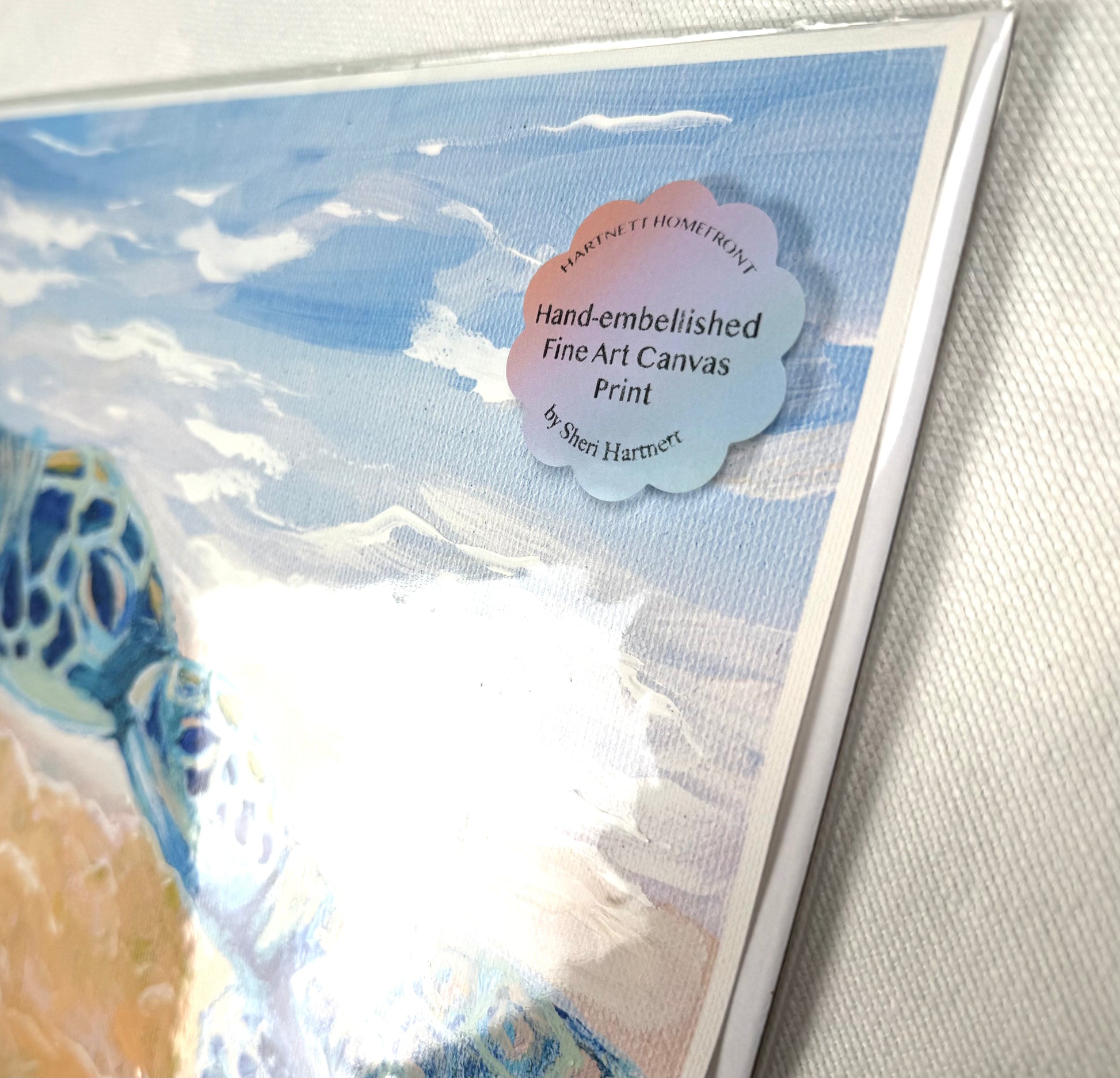 This sweet baby Sea Turtle finding its mama on the way to the ocean for the first time captures the beauty we live with every day. Printed on high-quality canvas sheets and hand-embellished with acrylic paints personally done by the artist, Sheri. H and-embellishing makes each reproduction it's own, one-of-a-kind prints, and gives the feel of an original painting with texture.