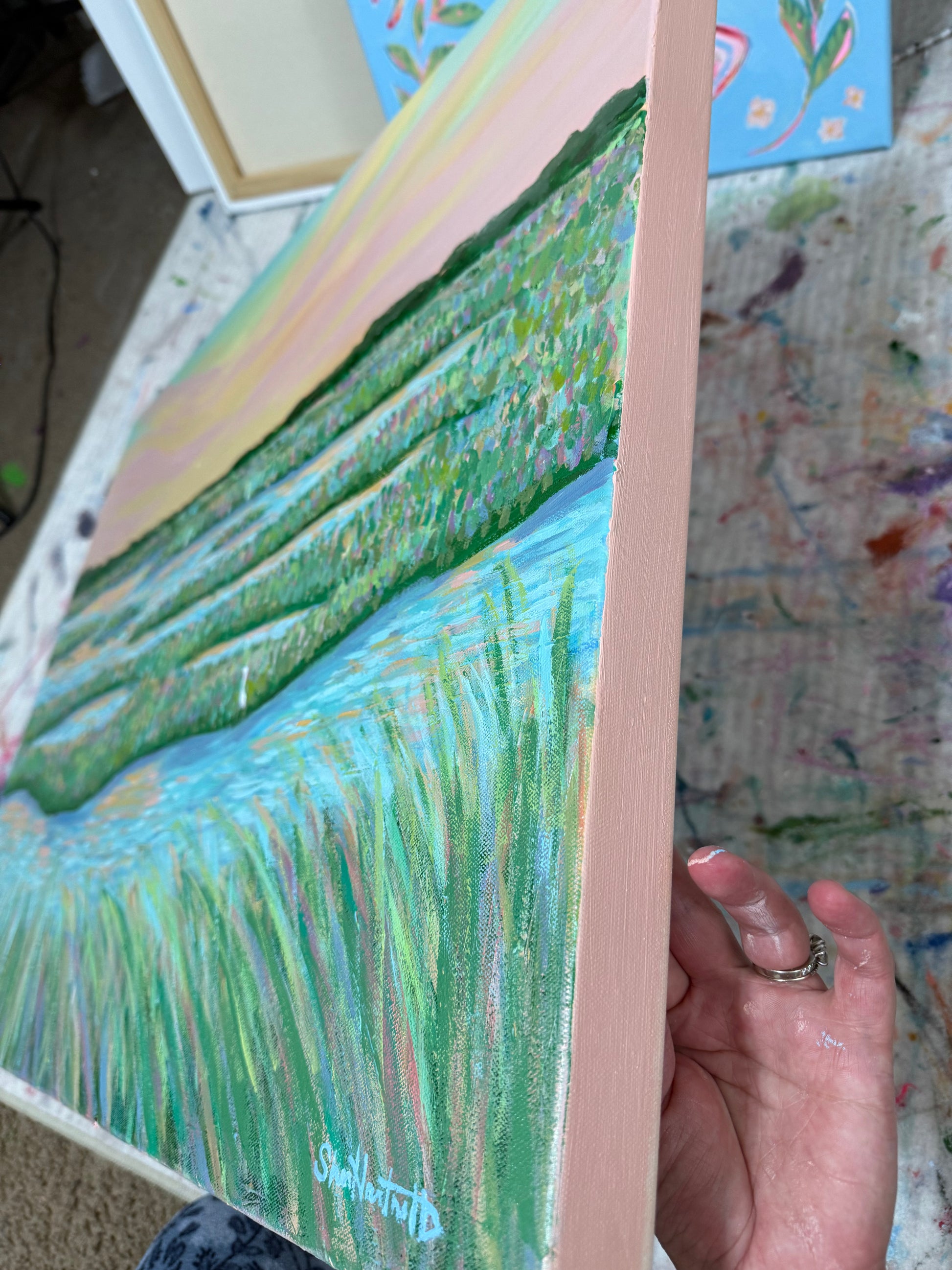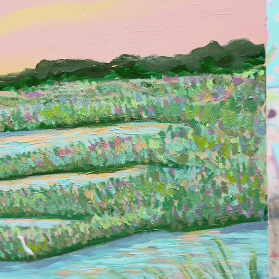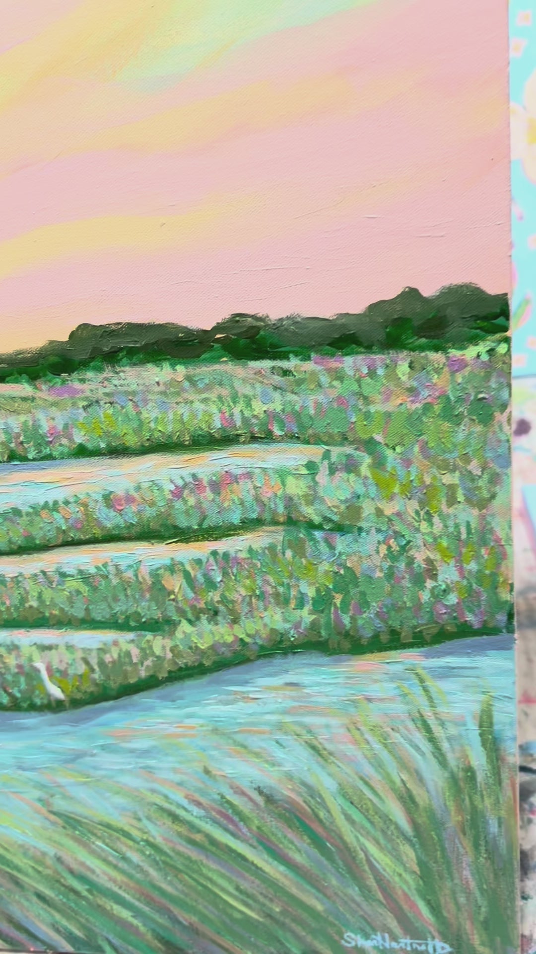 Vibrant colors make up the details of this sunset marsh landscape, complete with resting herons. The textures and colors make this piece so beautiful on person. Don’t miss out on a one-of-a-kind original piece that captures the beauty of the marsh.