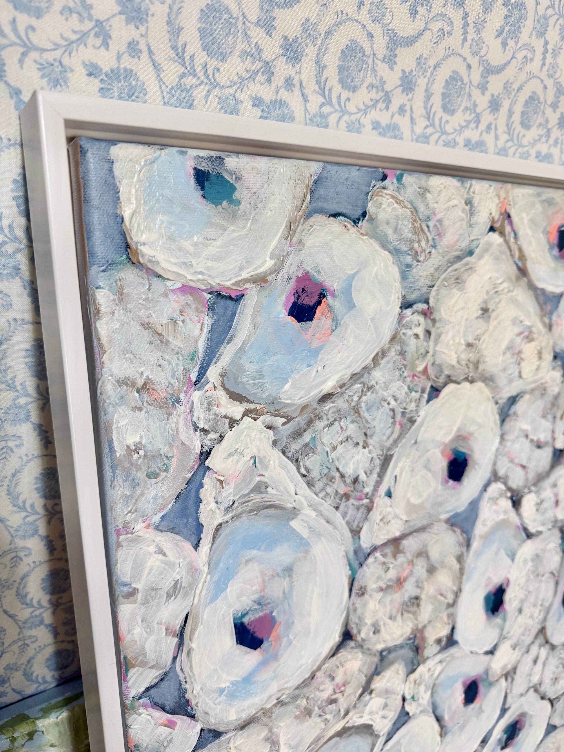 “Oyster Season” captures the abundance and beauty of freshly shucked oysters in a richly layered, expressive composition. This original 18x24 acrylic painting features soft whites, pale blues, muted lavender, and deep navy centers nestled against a calming blue-gray background.