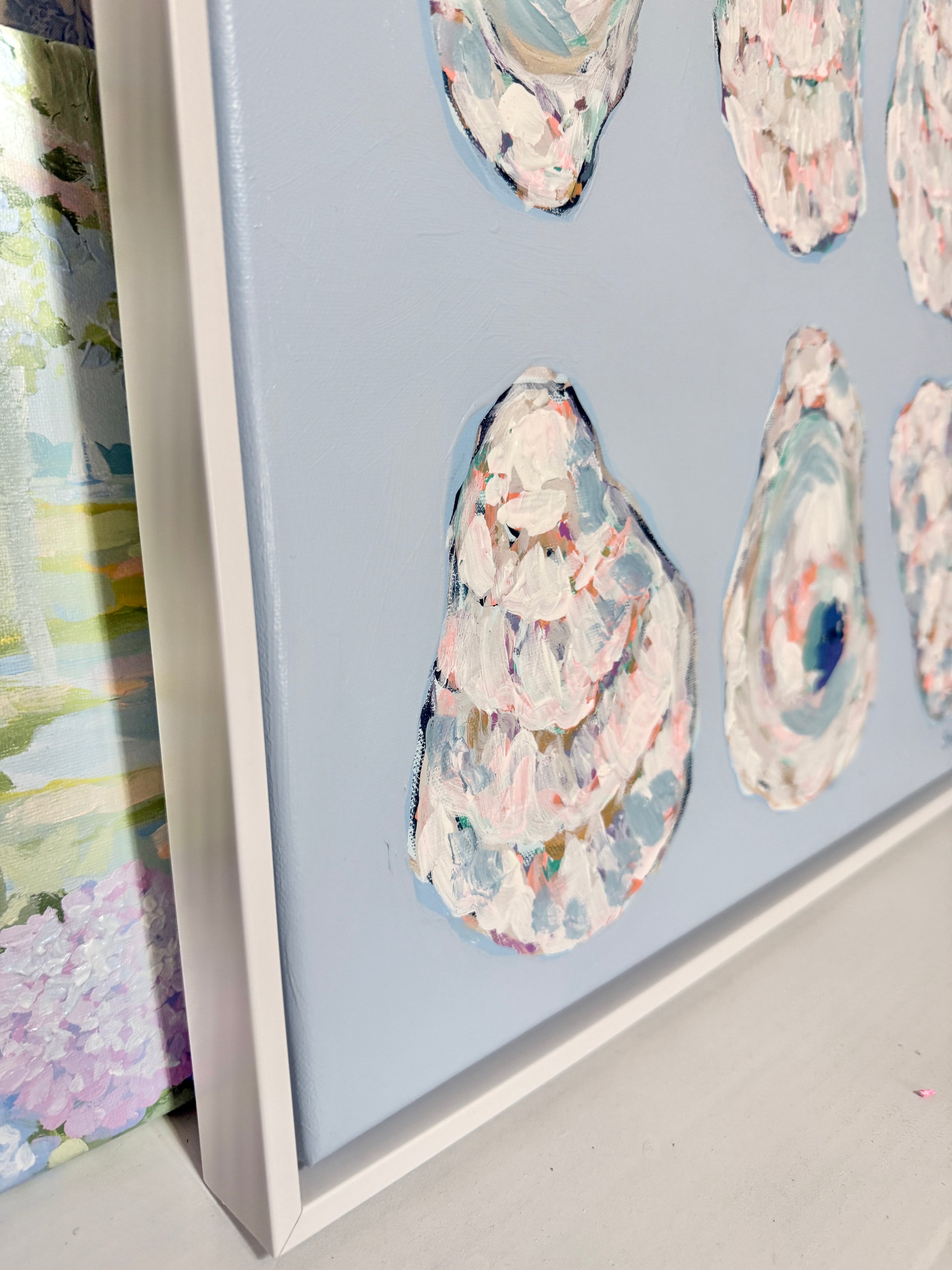 “Oysters” is an original 18x24 acrylic painting featuring nine expressive oyster shells arranged in a clean, modern composition. Soft coastal tones of seafoam, blush, layered whites, and deep navy accents bring subtle movement and life to the piece.