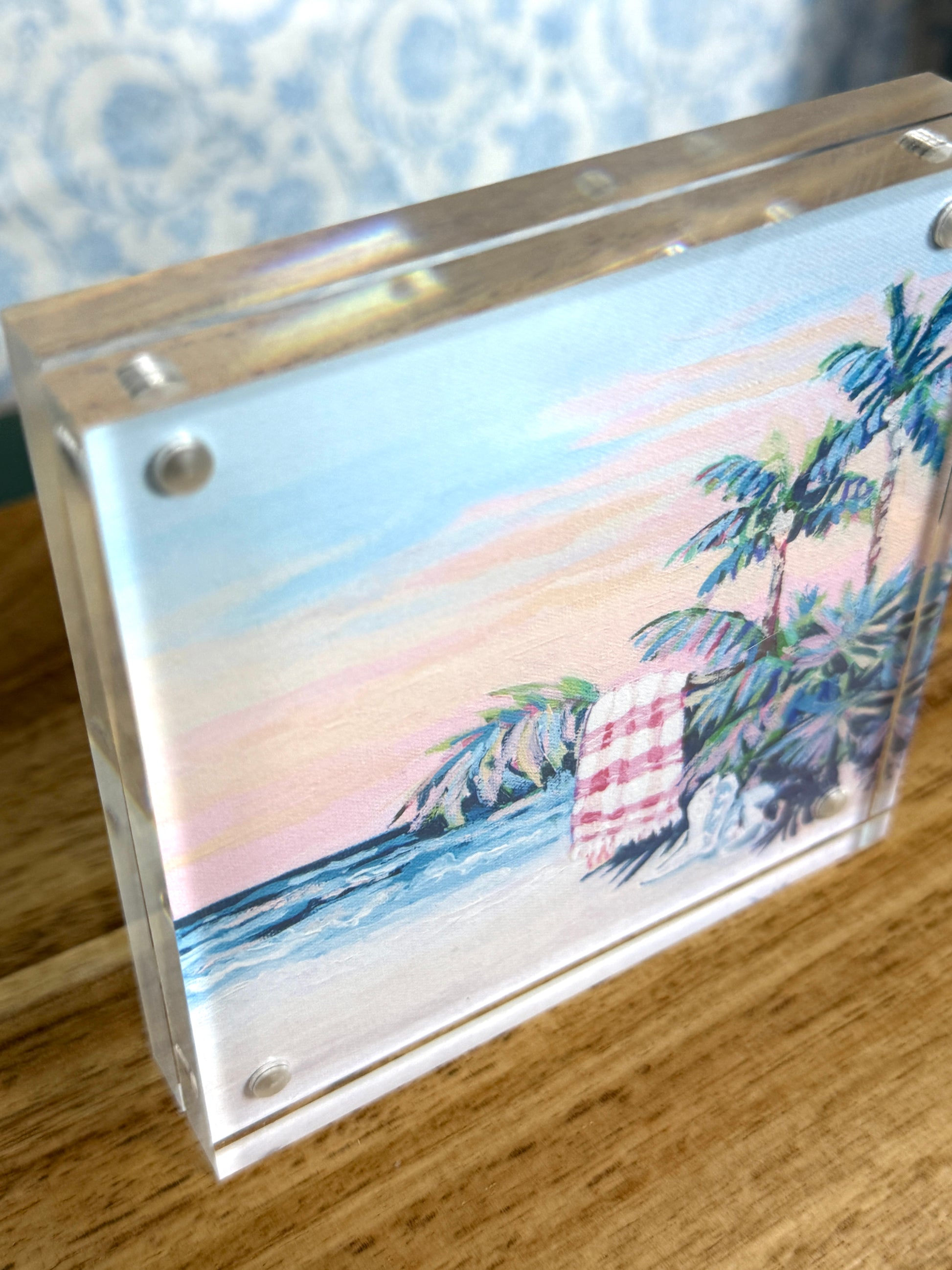Framed in this sleek acrylic border less frame it will make the perfect accent for a shelf, tray, or mantle. It’s also a great keepsake and gift!