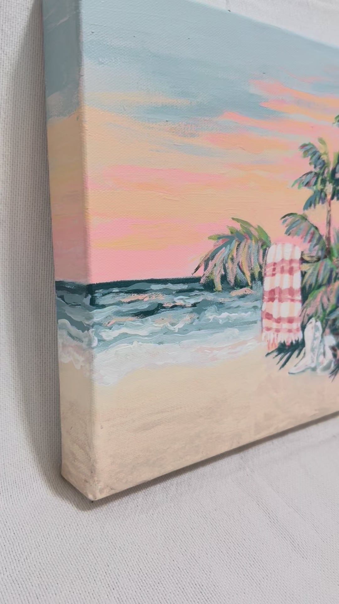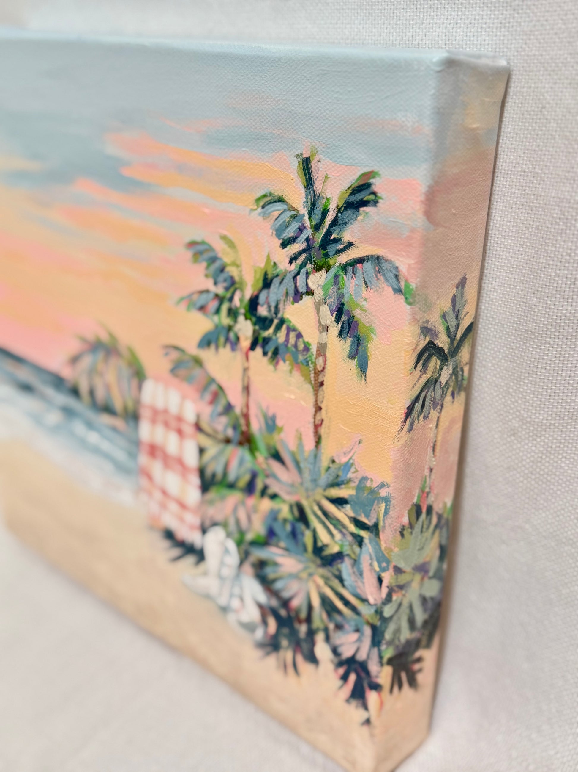 This piece captures a beautiful tropical beach scene with a coastal cowgirl vibe. Bold colors, detailed strokes with texture, and the cutest boots make this original piece stand out.